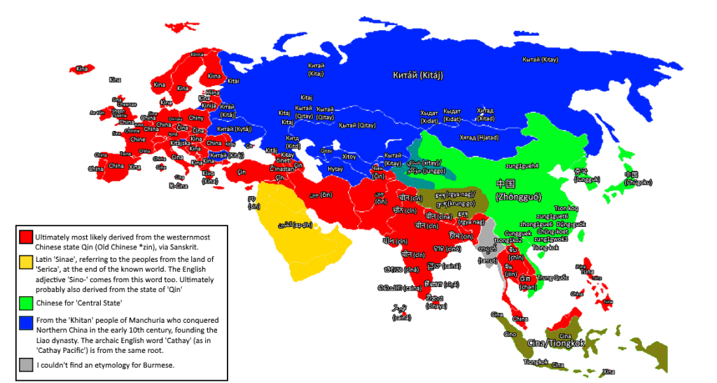 The majority of China’s names can be grouped into two categories: variations derived from “Qin” (秦, Qín) — the Qin Dynasty — and variations of “Zhongguo” (中国 / 中國, Zhōngguó), the name China uses for itself, meaning “Central Country” or “Middle Kingdom.”